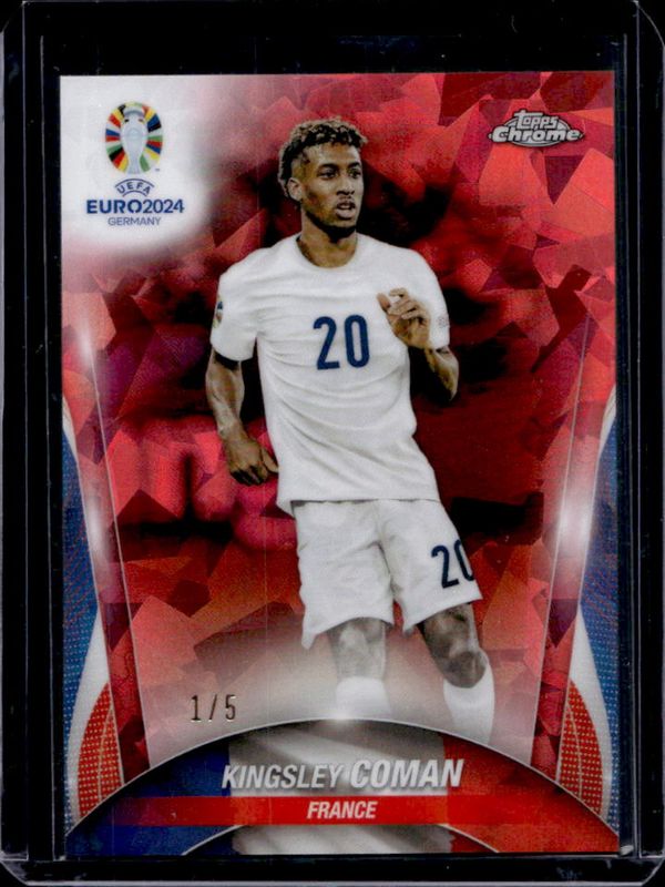 The Kingsley Coman 2024 Topps Chrome Sapphire Edition UEFA Euro #83 Chrome - Red /5 card is 1 of 6 Kingsley Coman's card variations in the 2024 Topps Chrome Sapphire Edition UEFA Euro set being tracked by Sports Card Investor, including Chrome, Chrome - Gold /50, Chrome - Orange /25, Chrome - Black /10, and Chrome - Padparadscha /1.