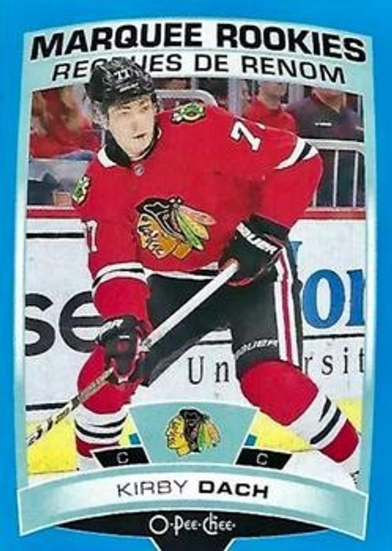 The Kirby Dach 2019 Upper Deck #612 2019 O-Pee-Chee Update Blue Border Rookie card is 1 of 45 Kirby Dach's card variations in the 2019 Upper Deck set being tracked by Sports Card Investor, including Young Guns Base, Young Guns Canvas, Young Guns - Clear Cut, Young Guns - Clear Cut Exclusives, and Young Guns - Silver Foil.