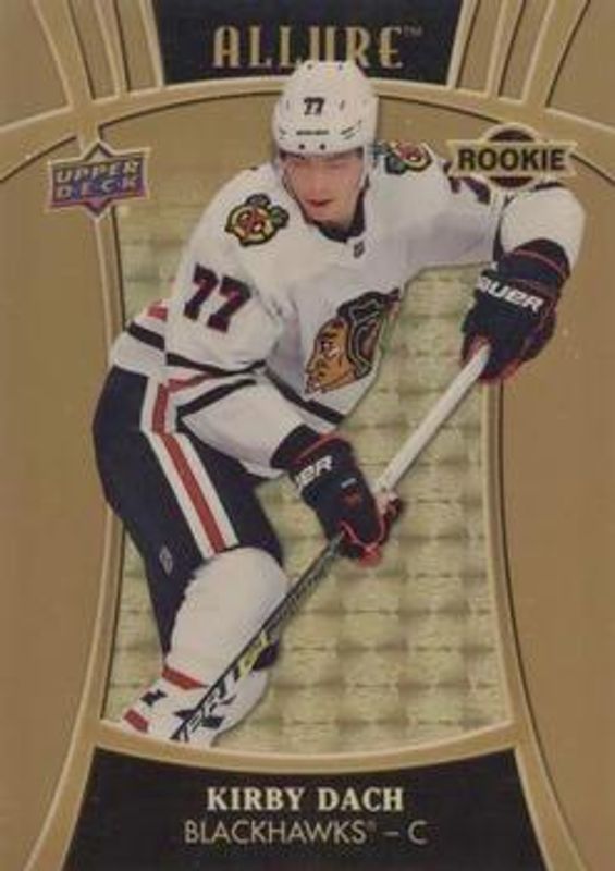 The Kirby Dach 2019 Upper Deck Allure #107 Golden Treasures /1 Rookie card is 1 of 42 Kirby Dach's card variations in the 2019 Upper Deck Allure set being tracked by Sports Card Investor, including #107 Base, #89 Base, #89 Pewter, #107 Pink Diamond, and #89 Red Rainbow.