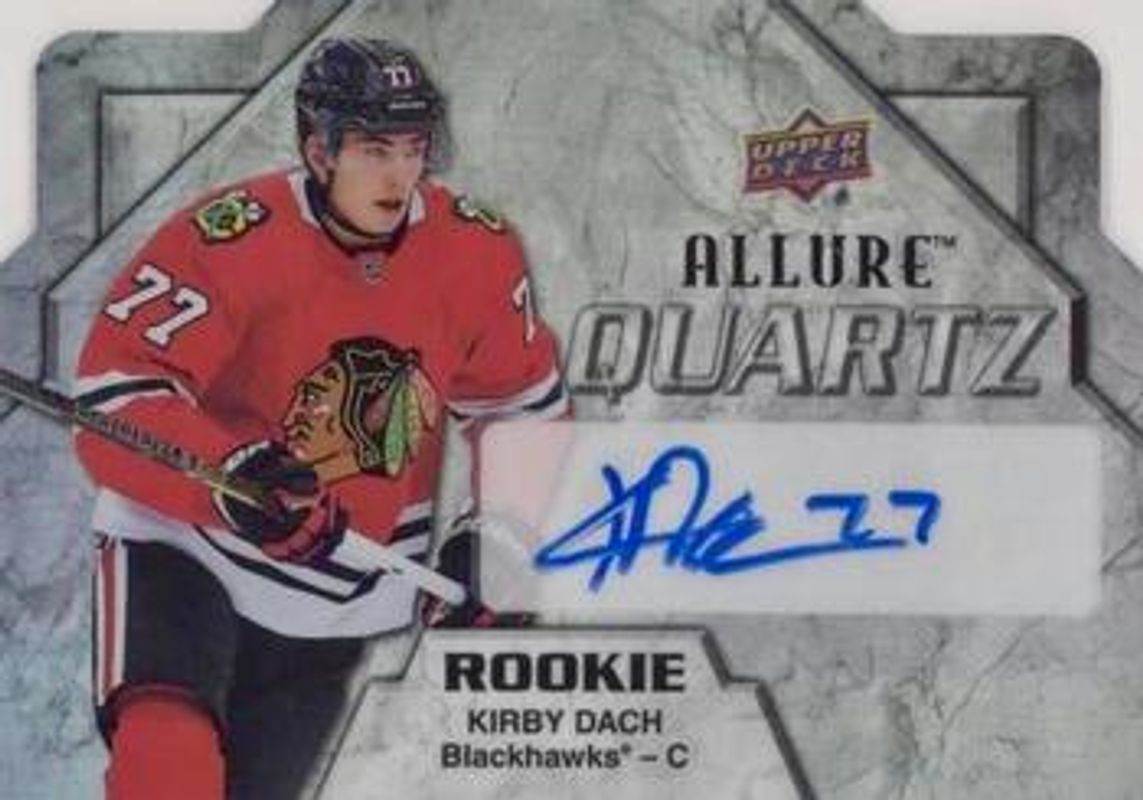 The Kirby Dach 2019 Upper Deck Allure #AQR-KD Quartz Rookie Autographs card is 1 of 42 Kirby Dach's card variations in the 2019 Upper Deck Allure set being tracked by Sports Card Investor, including #107 Base, #89 Base, #89 Pewter, #107 Pink Diamond, and #89 Red Rainbow.
