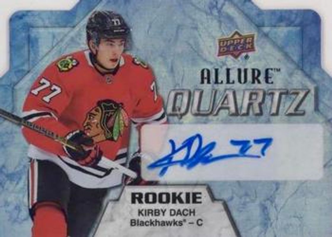 The Kirby Dach 2019 Upper Deck Allure #AQR-KD Quartz Rookie Autographs Blue /5 card is 1 of 42 Kirby Dach's card variations in the 2019 Upper Deck Allure set being tracked by Sports Card Investor, including #107 Base, #89 Base, #89 Pewter, #107 Pink Diamond, and #89 Red Rainbow.
