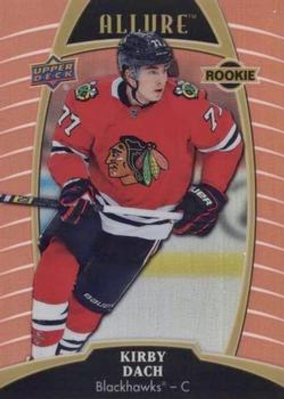 The Kirby Dach 2019 Upper Deck Allure #89 Sunset Rookie card is 1 of 42 Kirby Dach's card variations in the 2019 Upper Deck Allure set being tracked by Sports Card Investor, including #107 Base, #89 Base, #89 Pewter, #107 Pink Diamond, and #89 Red Rainbow.