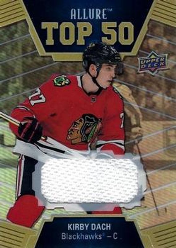 The Kirby Dach 2019 Upper Deck Allure #T50-2 Top 50 Jersey Relics Rookie card is 1 of 42 Kirby Dach's card variations in the 2019 Upper Deck Allure set being tracked by Sports Card Investor, including #107 Base, #89 Base, #89 Pewter, #107 Pink Diamond, and #89 Red Rainbow.