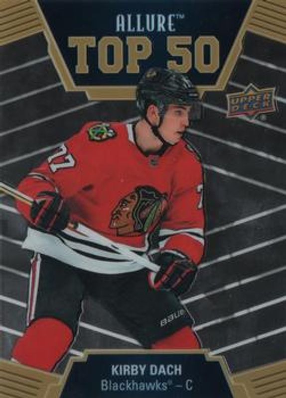 The Kirby Dach 2019 Upper Deck Allure #T50-2 Top 50 Rookie card is 1 of 42 Kirby Dach's card variations in the 2019 Upper Deck Allure set being tracked by Sports Card Investor, including #107 Base, #89 Base, #89 Pewter, #107 Pink Diamond, and #89 Red Rainbow.