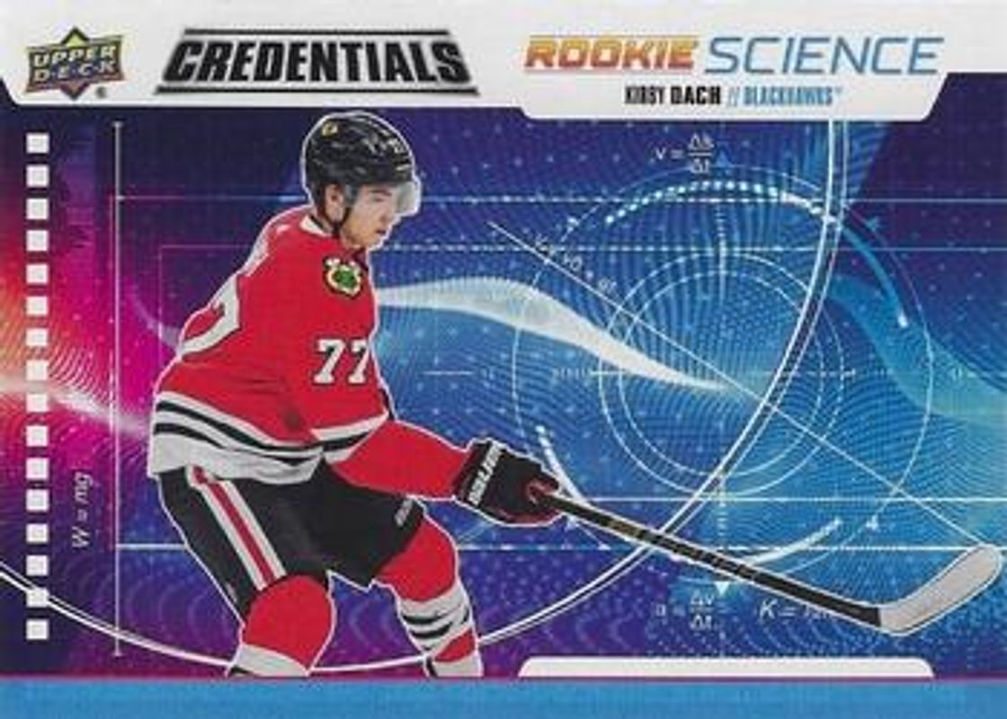 The Kirby Dach 2019 Upper Deck Credentials #RS-26 Rookie Science card is 1 of 22 Kirby Dach's card variations in the 2019 Upper Deck Credentials set being tracked by Sports Card Investor, including Base /699, Red /99, Green /25, Purple /10, and Black /1.