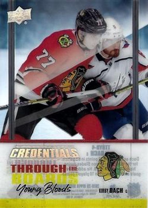 The Kirby Dach 2019 Upper Deck Credentials #TTBYB-4 Through the Boards Rookie card is 1 of 22 Kirby Dach's card variations in the 2019 Upper Deck Credentials set being tracked by Sports Card Investor, including Base /699, Red /99, Green /25, Purple /10, and Black /1.