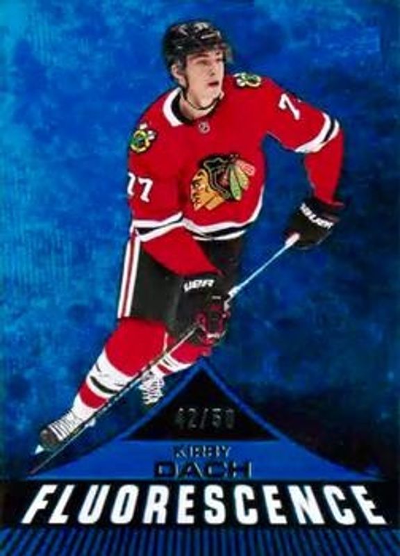 The Kirby Dach 2019 Upper Deck #F-2 Fluorescence - Blue /50 Rookie card is 1 of 45 Kirby Dach's card variations in the 2019 Upper Deck set being tracked by Sports Card Investor, including Young Guns Base, Young Guns Canvas, Young Guns - Clear Cut, Young Guns - Clear Cut Exclusives, and Young Guns - Silver Foil.