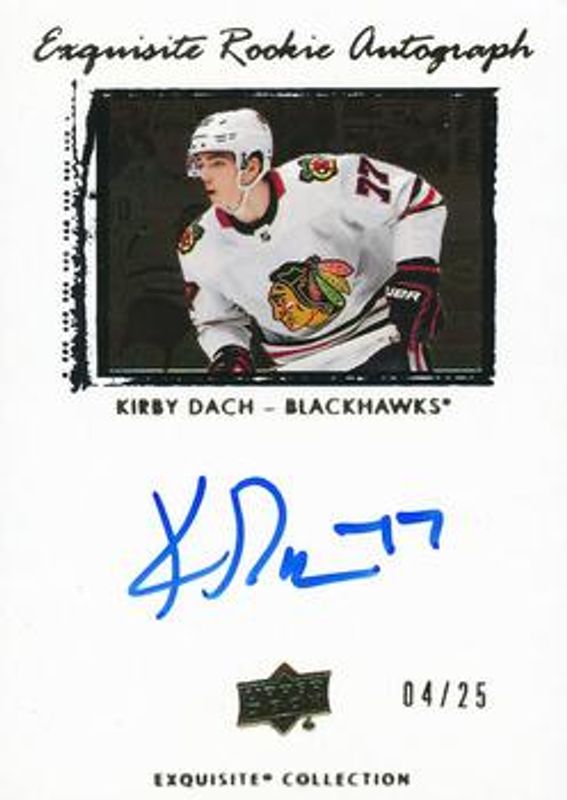 The Kirby Dach 2019 Upper Deck Ice #09T-KD Exquisite Collection 2009 Rookie Auto Tribute - Gold /25 card is 1 of 19 Kirby Dach's card variations in the 2019 Upper Deck Ice set being tracked by Sports Card Investor, including Base /499, Black /1, Ice Premieres die-cut, Ice Premieres - Jersey Relics, and Sub Zero Rookies Blue Auto.