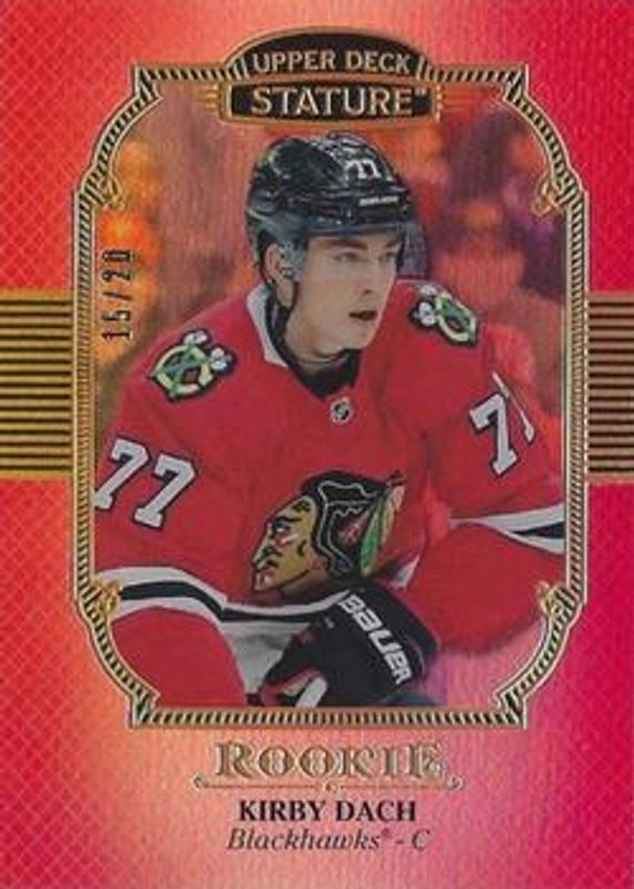 The Kirby Dach 2019 Upper Deck Stature #125 Portrait Variant Red /20 Rookie card is 1 of 27 Kirby Dach's card variations in the 2019 Upper Deck Stature set being tracked by Sports Card Investor, including Base /399, Autographs /199, Green /149, Autographs Green /85, and Portrait Variant /85.