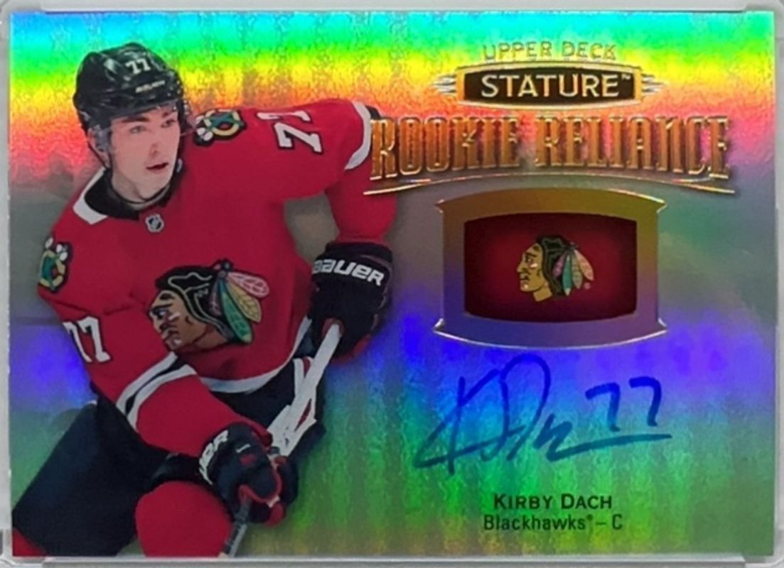 The Kirby Dach 2019 Upper Deck Stature #RR-39 Rookie Reliance Autographs card is 1 of 27 Kirby Dach's card variations in the 2019 Upper Deck Stature set being tracked by Sports Card Investor, including Base /399, Autographs /199, Green /149, Autographs Green /85, and Portrait Variant /85.