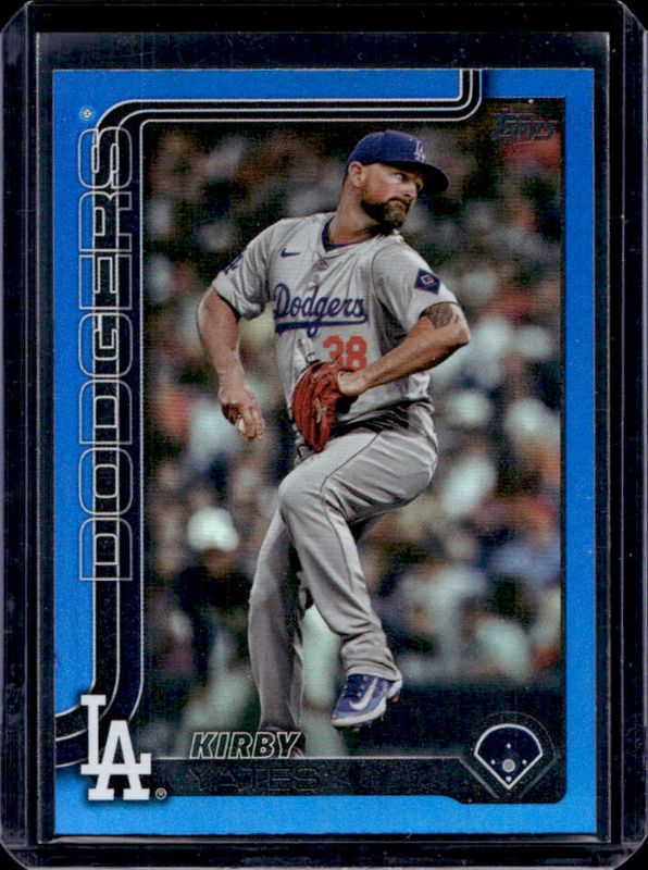 The Kirby Yates 2025 Topps #397 Blue Rainbow /150 card is 1 of 57 Kirby Yates' card variations in the 2025 Topps set being tracked by Sports Card Investor, including Base, Aqua Holo Foil, Diamante Foil, Holo Foil, and Pink Diamante Foil.