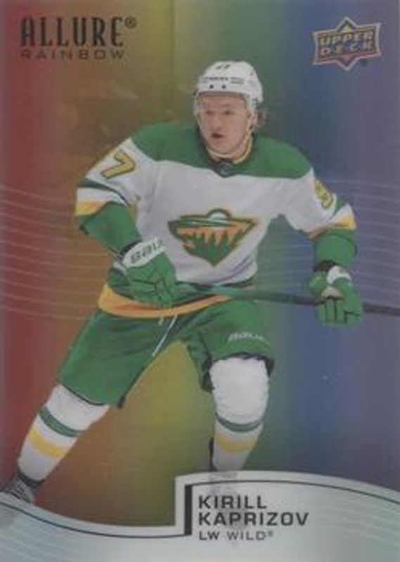 The Kirill Kaprizov 2021 Upper Deck Allure #R-51 Full Rainbow Achievements card is 1 of 33 Kirill Kaprizov's card variations in the 2021 Upper Deck Allure set being tracked by Sports Card Investor, including Base, Black Rainbow, Blue China, Orange Slice die-cut, and Pink Blue Leopard.