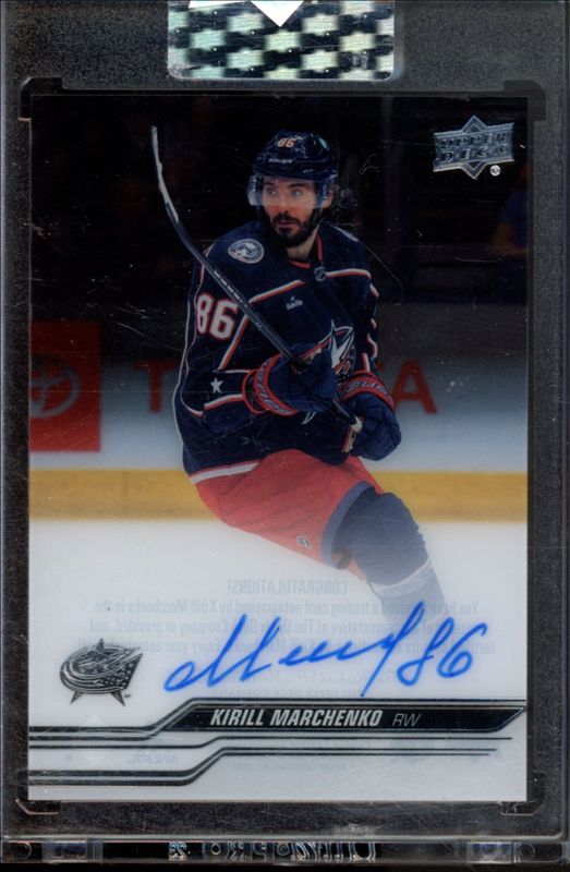The Kirill Marchenko 2023 Upper Deck Clear Cut #CC-KM Base card is 1 of 7 Kirill Marchenko's card variations in the 2023 Upper Deck Clear Cut set being tracked by Sports Card Investor, including Outburst /25, High Gloss /10, Outburst Gold /1, 1998-99 Black Diamond Myriad Autographs, and 1998-99 Black Diamond Myriad Autographs - Blue /25.