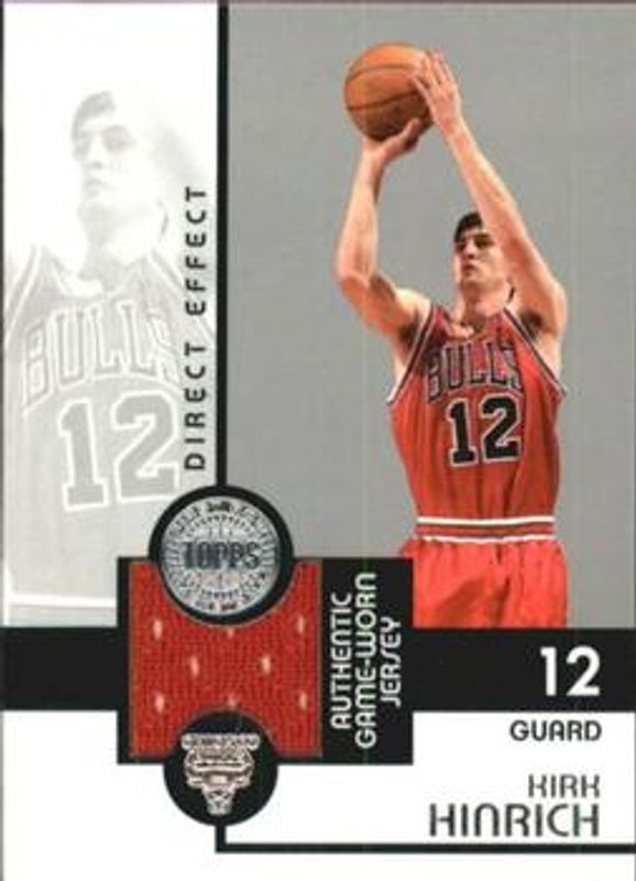 The Kirk Hinrich 2005 Topps First Row #DE-KH Direct Effect /200 card is 1 of 12 Kirk Hinrich's card variations in the 2005 Topps First Row set being tracked by Sports Card Investor, including Base /549, Gold Rainbow /325, Black & White /225, Gold /100, and Sepia /25.