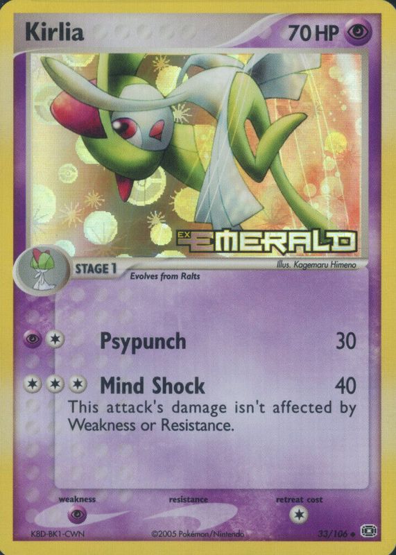 The Kirlia 2005 EX: Emerald #033/106 Base card in Raw TCG (Near Mint) condition has moved up $1.03 (+26.5%) in the last 30 days and was last sold for $4.92 .