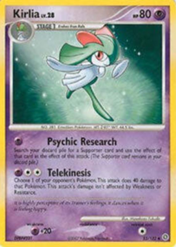 The Kirlia 2007 Diamond & Pearl: Secret Wonders #053/132 Base card in Raw TCG (Near Mint) condition has not changed in price in the last 30 days and was last sold for $2.89 .