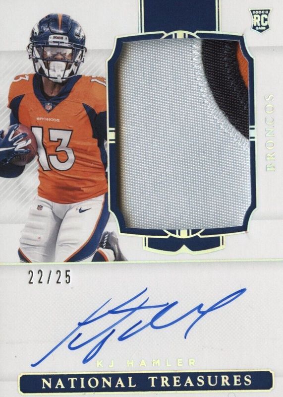 This card is 1 of 23 KJ Hamler's card variations in the 2020 National Treasures set being tracked by Sports Card Investor, including Rookie Patch Auto /99, Rookie Patch Auto - Green Jersey Number (/13), Rookie Patch Auto - Midnight /20, Rookie Patch Auto - Stars & Stripes /20, and Rookie Patch Auto - Holo Gold /10.