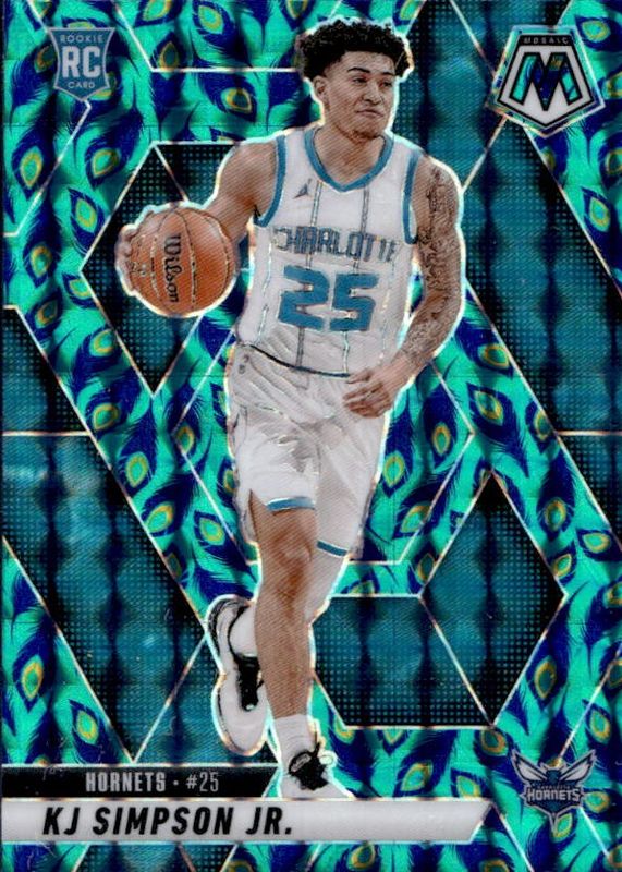 The KJ Simpson Jr. 2024 Mosaic #239 Choice Peacock /(SSP) Rookie card in Raw condition has not changed in price in the last 30 days and was last sold for $15.50 .