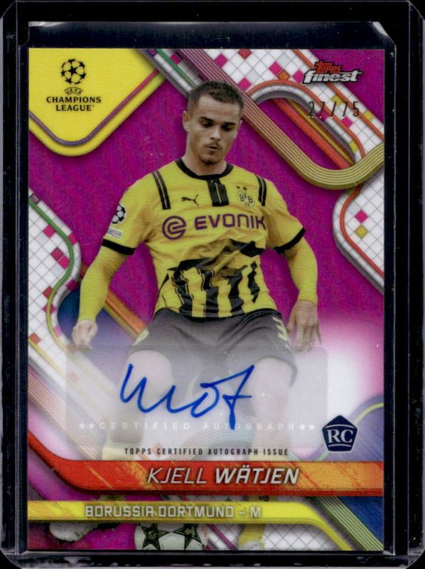 The Kjell Watjen 2024 Topps Finest UEFA Club Competitions #BA-KW Base Autographs - Magenta Refractor /75 Rookie card is 1 of 62 Kjell Watjen's card variations in the 2024 Topps Finest UEFA Club Competitions set being tracked by Sports Card Investor, including Base, Refractor, Purple Refractor /299, Sky Blue Refractor /275, and Pink RayWave Refractor /250.