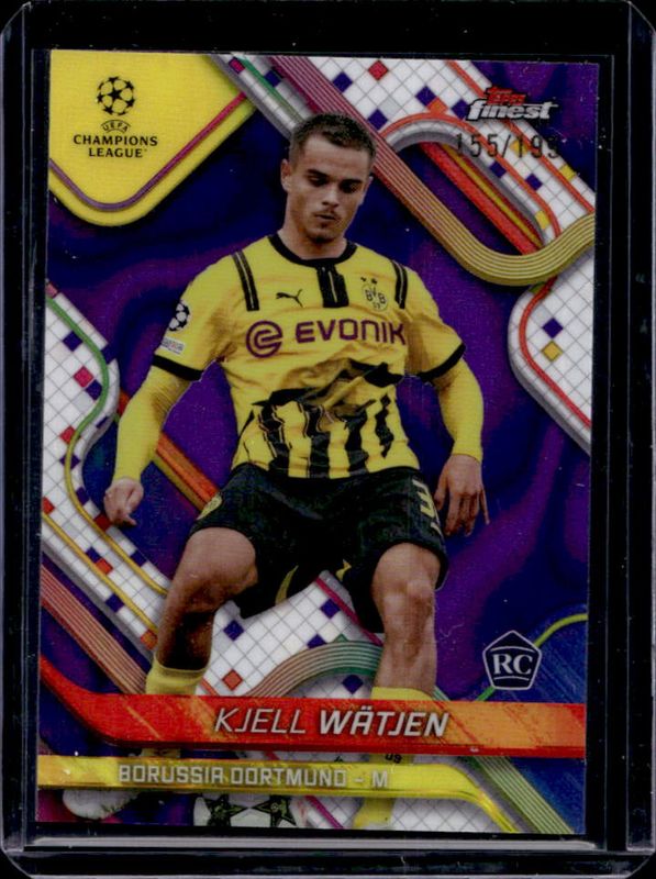 The Kjell Watjen 2024 Topps Finest UEFA Club Competitions #38 Purple Lava Refractor /199 Rookie card is 1 of 62 Kjell Watjen's card variations in the 2024 Topps Finest UEFA Club Competitions set being tracked by Sports Card Investor, including Base, Refractor, Purple Refractor /299, Sky Blue Refractor /275, and Pink RayWave Refractor /250.
