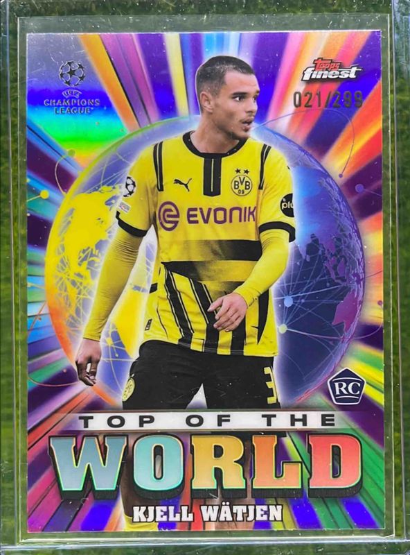 The Kjell Watjen 2024 Topps Finest UEFA Club Competitions #TW-35 Top of the World - Purple Refractor /299 Rookie card is 1 of 62 Kjell Watjen's card variations in the 2024 Topps Finest UEFA Club Competitions set being tracked by Sports Card Investor, including Base, Refractor, Purple Refractor /299, Sky Blue Refractor /275, and Pink RayWave Refractor /250.