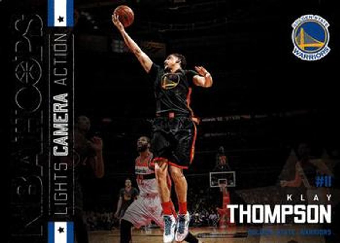 The Klay Thompson 2015 Hoops #25 Lights...Camera...Action! card is 1 of 26 Klay Thompson's card variations in the 2015 Hoops set being tracked by Sports Card Investor, including Base, Gold, Green, Red Back, and Blue /399.