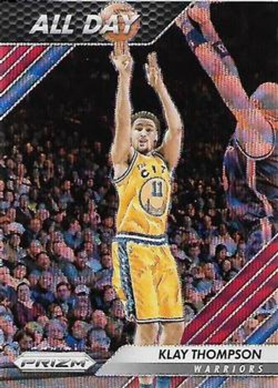 The Klay Thompson 2016 Prizm #12 All Day - Ruby Wave card is 1 of 42 Klay Thompson's card variations in the 2016 Prizm set being tracked by Sports Card Investor, including Base, Green, Ruby Wave, Silver, and Starburst.