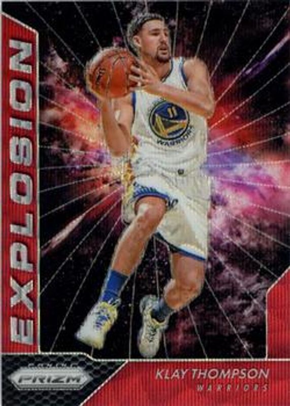 The Klay Thompson 2016 Prizm #9 Explosion - Ruby Wave card is 1 of 42 Klay Thompson's card variations in the 2016 Prizm set being tracked by Sports Card Investor, including Base, Green, Ruby Wave, Silver, and Starburst.