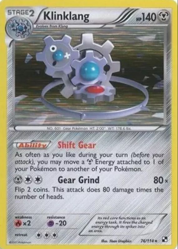 The Klinklang 2011 Black & White #076/114 Holo card in Raw TCG (Lightly Played) condition has moved up $2.19 (+118%) in the last 30 days and was last sold for $4.04 .