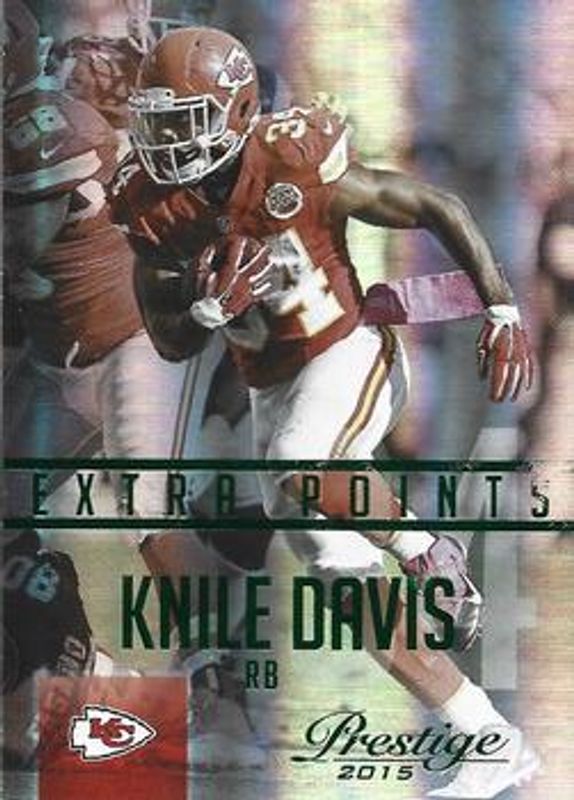The Knile Davis 2015 Prestige #166 Extra Points Green card is 1 of 12 Knile Davis' card variations in the 2015 Prestige set being tracked by Sports Card Investor, including Base, Extra Points Blue, Extra Points Red, Extra Points Purple /100, and Extra Points Gold /50.