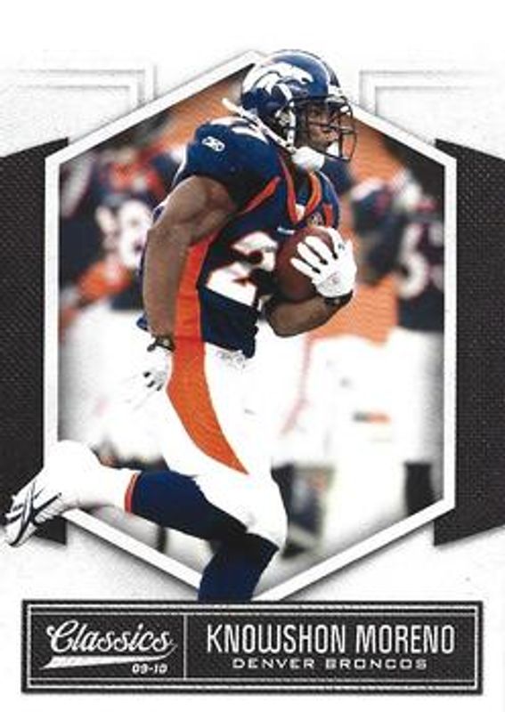 The Knowshon Moreno 2010 Classics #30 Base /999 card is 1 of 11 Knowshon Moreno's card variations in the 2010 Classics set being tracked by Sports Card Investor, including Timeless Tributes Silver /100, Timeless Tributes Gold /50, Timeless Tributes Platinum /25, Membership, and Membership VIP Jerseys /299.