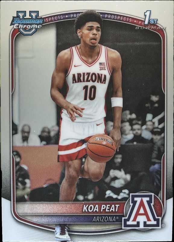 The Koa Peat 2025 Bowman #BCP-3 Chrome Prospects card is 1 of 182 Koa Peat's card variations in the 2025 Bowman set being tracked by Sports Card Investor, including #CPA-KP Chrome - Mojo Refractor, #BCP-3 Chrome - Mojo Refractor, #BCP-3 Chrome - Fuchsia Mojo Refractor /299, #BCP-3 Chrome - Purple Mojo Refractor /250, and #BCP-3 Chrome - Pink Mojo Refractor /199.