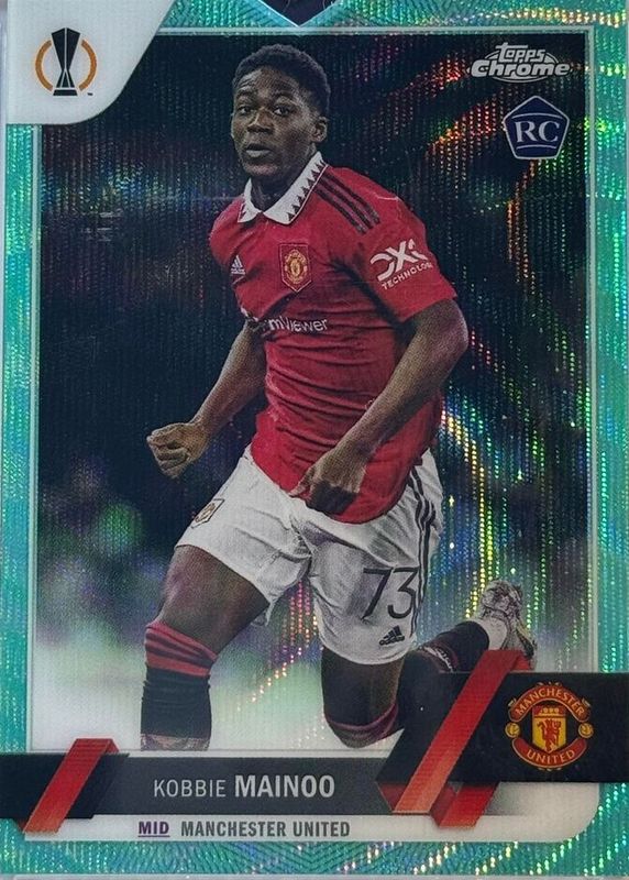This card is 1 of 29 Kobbie Mainoo's card variations in the 2022 Topps Chrome UEFA Club Competitions set being tracked by Sports Card Investor, including Base, Black & White RayWave Refractor, Gold Lava Refractor, Neon Green Lava Refractor, and Orange & Gold Seismic Refractor.