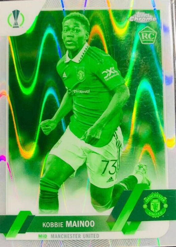This card is 1 of 29 Kobbie Mainoo's card variations in the 2022 Topps Chrome UEFA Club Competitions set being tracked by Sports Card Investor, including Base, Black & White RayWave Refractor, Gold Lava Refractor, Neon Green Lava Refractor, and Orange & Gold Seismic Refractor.