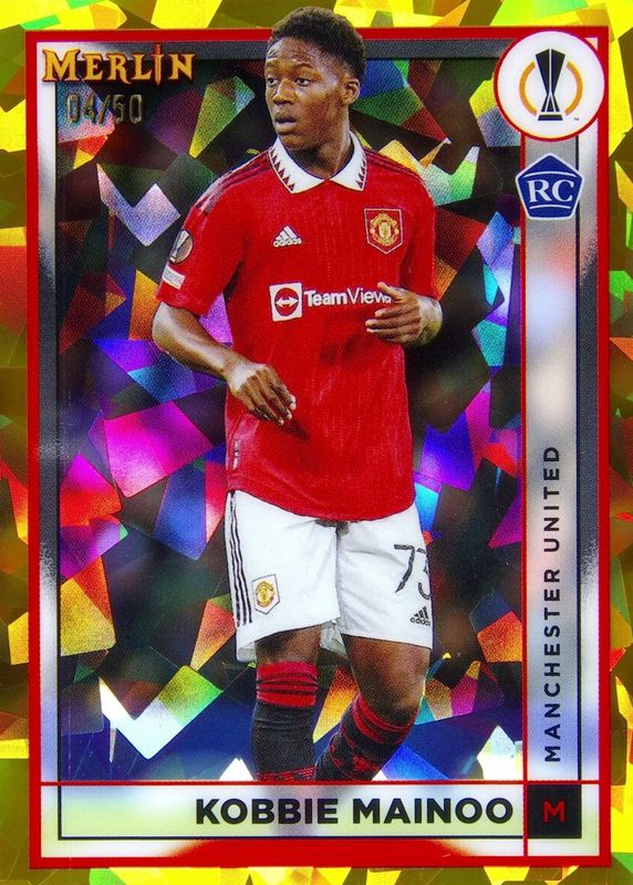 This card is 1 of 41 Kobbie Mainoo's card variations in the 2022 Topps Merlin Chrome UEFA Club Competitions set being tracked by Sports Card Investor, including Base, Aqua Prism Refractor, Refractor, Vintage Merlin Refractor, and Neon Green Shimmer Refractor /350.