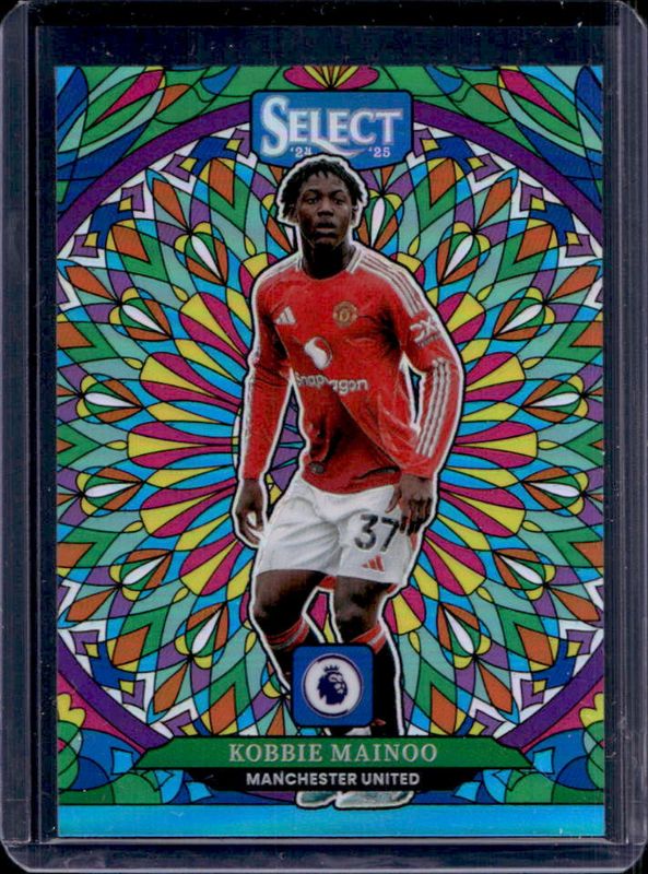 The Kobbie Mainoo 2024 Select Premier League #7 Stained Glass card is 1 of 58 Kobbie Mainoo's card variations in the 2024 Select Premier League set being tracked by Sports Card Investor, including Artistic Impressions, Autographed Memorabilia Blue Pulsar, Autographed Memorabilia Peacock, Autographed Memorabilia Red, and Mezzanine.