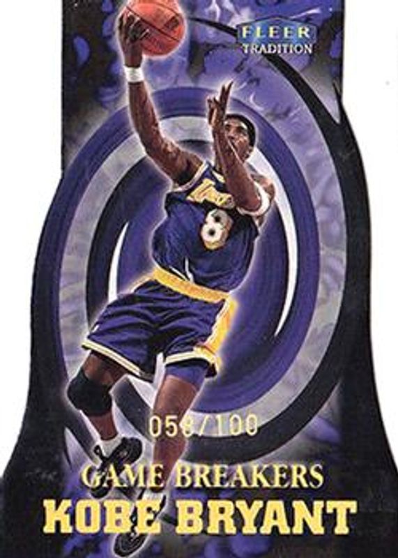 The Kobe Bryant 1999 Fleer Tradition #2-GB Game Breakers /100 card is 1 of 6 Kobe Bryant's card variations in the 1999 Fleer Tradition set being tracked by Sports Card Investor, including Base, Roundball Collection, Supreme Court Collection /20, Masters of the Hardwood, and Net Effect.