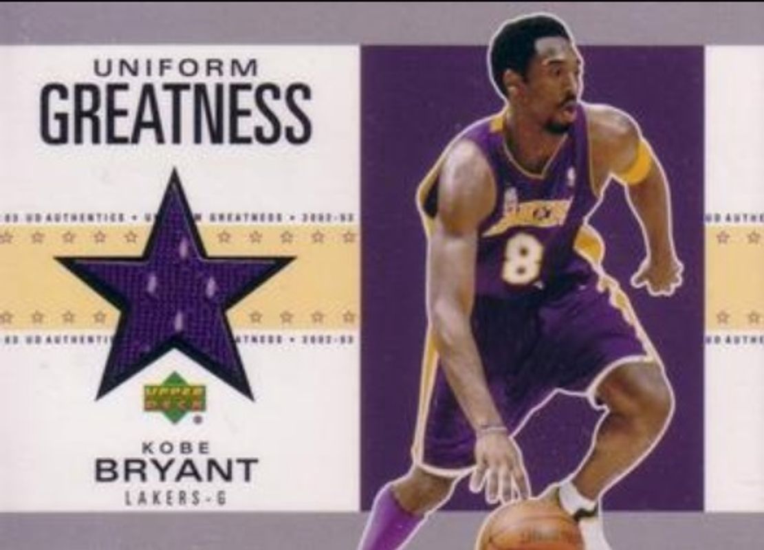 The Kobe Bryant 2002 Upper Deck Authentics #KB-U Uniform Greatness card is 1 of 31 Kobe Bryant's card variations in the 2002 Upper Deck Authentics set being tracked by Sports Card Investor, including #35 Base, #35 Gold /250, #35 Rainbow /50, #7 UDA, and #5 UDA.
