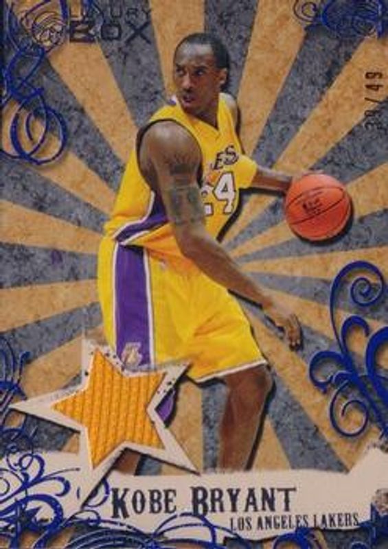 The Kobe Bryant 2006 Topps Luxury Box #MR-KB Mezzanine Relics Blue /49 card is 1 of 12 Kobe Bryant's card variations in the 2006 Topps Luxury Box set being tracked by Sports Card Investor, including Base /999, Red /499, Green /329, Blue /49, and Bronze /19.
