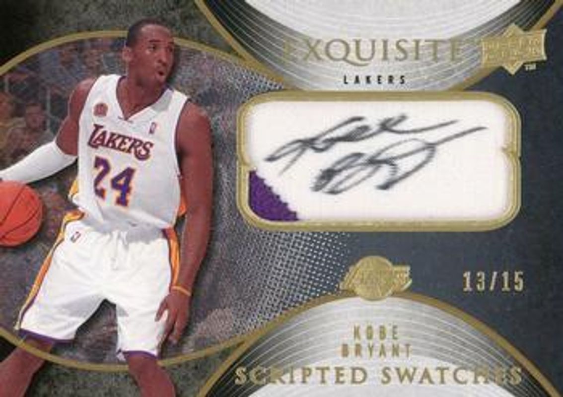 The Kobe Bryant 2007 Upper Deck Exquisite Collection #SS-KB Scripted Swatches /15 card is 1 of 27 Kobe Bryant's card variations in the 2007 Upper Deck Exquisite Collection set being tracked by Sports Card Investor, including Base /99, Gold /25, Black /1, Press Plates Black /1, and Press Plates Cyan /1.