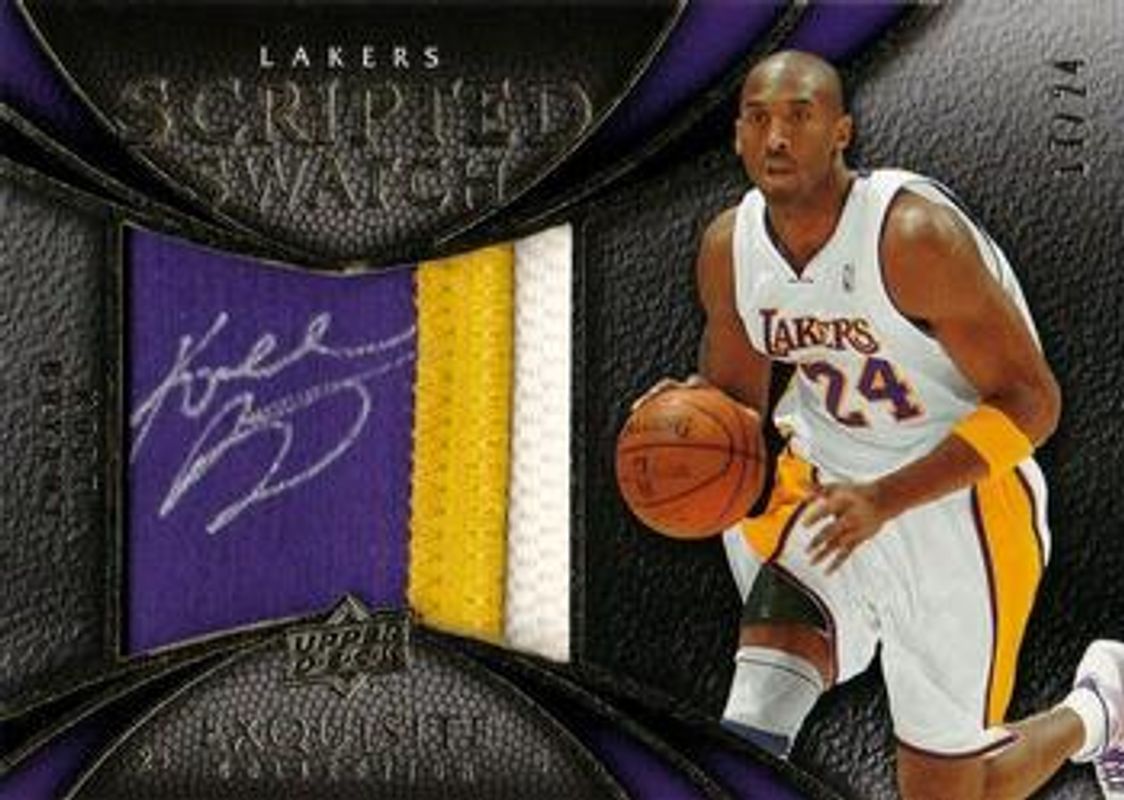 The Kobe Bryant 2008 Upper Deck Exquisite Collection #SCRP-KB Scripted Swatches /25 card is 1 of 30 Kobe Bryant's card variations in the 2008 Upper Deck Exquisite Collection set being tracked by Sports Card Investor, including Base /125, Gold /50, Black /1, Printing Plate Black /1, and Printing Plate Cyan /1.