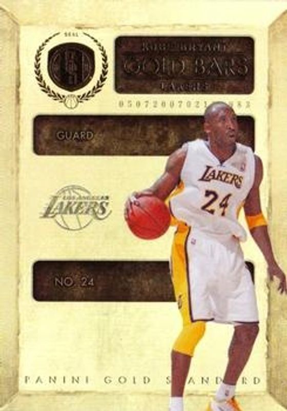 The Kobe Bryant 2010 Gold Standard #4 Gold Bars /299 card is 1 of 116 Kobe Bryant's card variations in the 2010 Gold Standard set being tracked by Sports Card Investor, including #2 Base /299, #2 Platinum Gold /25, #2 Black Gold /1, #12 24 Karat Kobe /299, and #13 24 Karat Kobe /299.