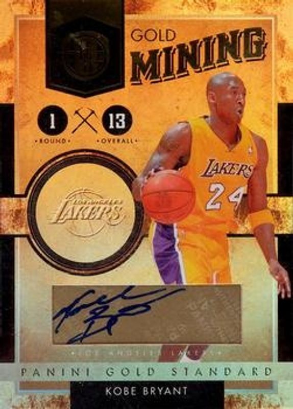 The Kobe Bryant 2010 Gold Standard #7 Gold Mining Signatures /99 card is 1 of 116 Kobe Bryant's card variations in the 2010 Gold Standard set being tracked by Sports Card Investor, including #2 Base /299, #2 Platinum Gold /25, #2 Black Gold /1, #12 24 Karat Kobe /299, and #13 24 Karat Kobe /299.