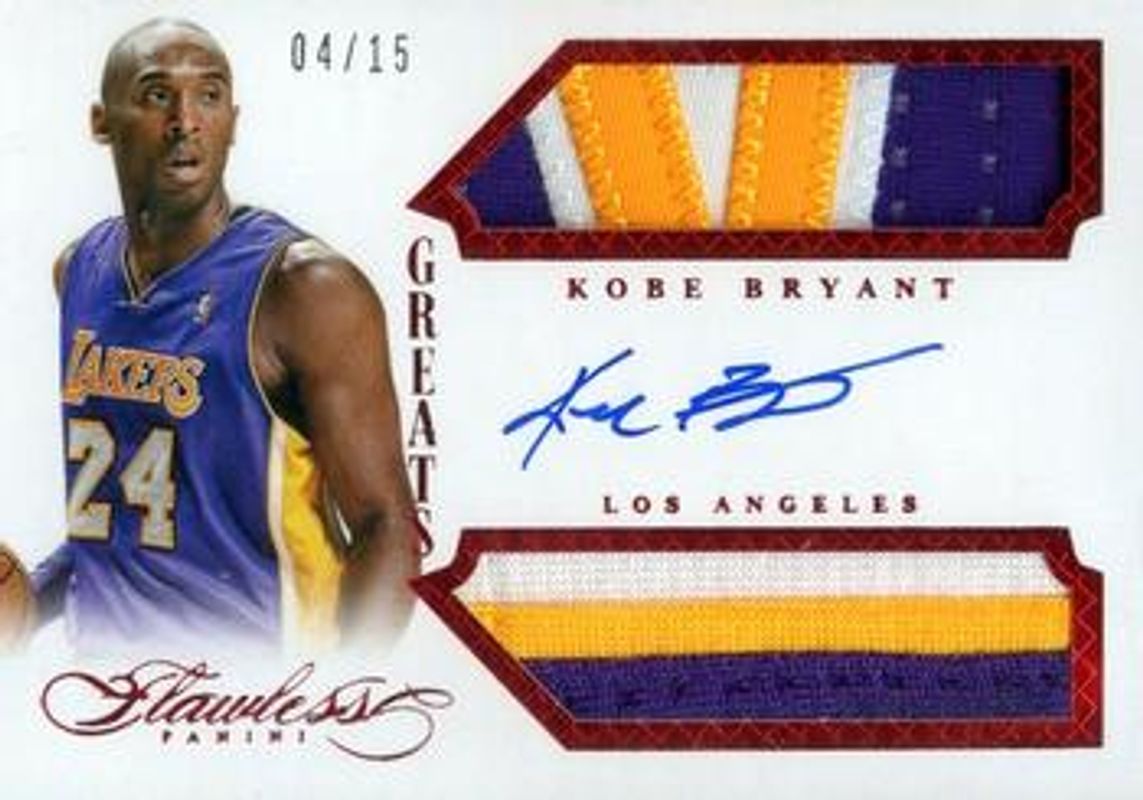 The Kobe Bryant 2013 Flawless #GR-KB Greats Dual Memorabilia Autographs - Ruby /15 card is 1 of 58 Kobe Bryant's card variations in the 2013 Flawless set being tracked by Sports Card Investor, including Base /20, Ruby /15, Sapphire /10, Emerald /5, and Platinum /1.