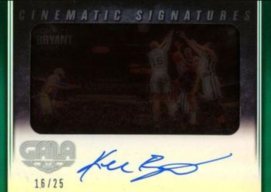 The Kobe Bryant 2014 Gala #1 Cinematic Signatures Jade /25 card is 1 of 14 Kobe Bryant's card variations in the 2014 Gala set being tracked by Sports Card Investor, including Base /79, Cinematic Signatures /49, Silver Screen Signatures /49, Award Winning Autographs /40, and Main Attraction Memorabilia /35.