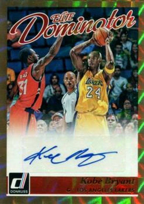 The Kobe Bryant 2015 Donruss #EDS-KB Elite Dominator Signatures - Gold /10 card is 1 of 37 Kobe Bryant's card variations in the 2015 Donruss set being tracked by Sports Card Investor, including Base, Inspirations Die-Cut, Status Die-Cut, Holo /199, and Statline Points /87.