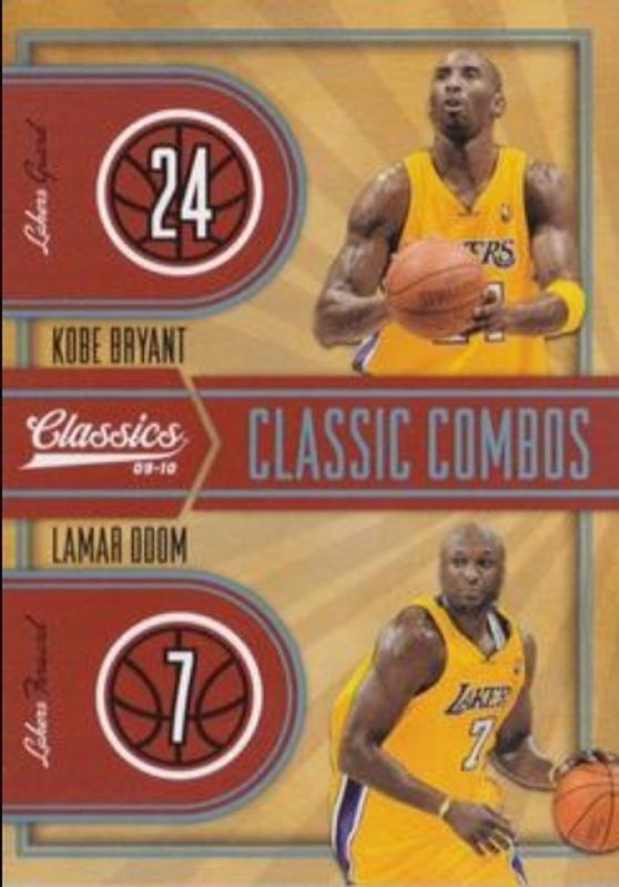 The Kobe Bryant / Lamar Odom 2009 Classics #1 Classic Combos - Platinum /25 card is 1 of 4 Kobe Bryant / Lamar Odom's card variations in the 2009 Classics set being tracked by Sports Card Investor, including Classic Combos, Classic Combos - Silver /250, and Classic Combos - Gold /100.