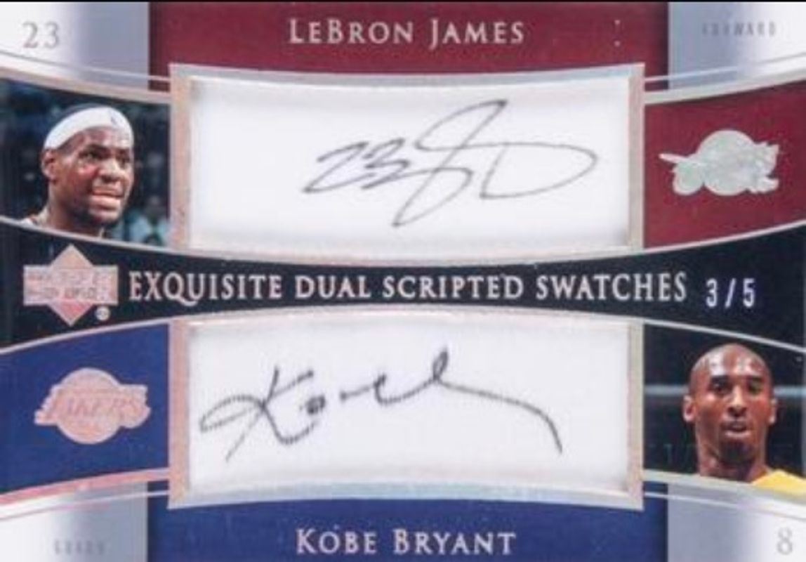 The Kobe Bryant / LeBron James 2004 Upper Deck Exquisite Collection #SS2-JB Dual Scripted Swatches /5 card is 1 of 3 Kobe Bryant / LeBron James' card variations in the 2004 Upper Deck Exquisite Collection set being tracked by Sports Card Investor, including Dual Exquisite Jerseys /10, and Dual NBA Logo Autographed Patches /1.