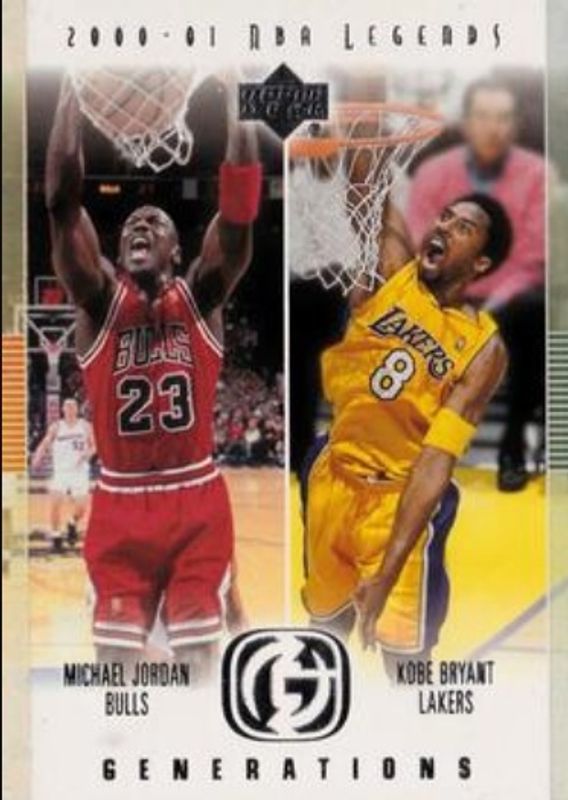 The Kobe Bryant / Michael Jordan 2000 Upper Deck Legends #G1 Generations card is 1 of 4 Kobe Bryant / Michael Jordan's card variations in the 2000 Upper Deck Legends set being tracked by Sports Card Investor, including Legendary Jerseys, Legendary Jerseys Autographed /50, and Legendary Signatures /10.