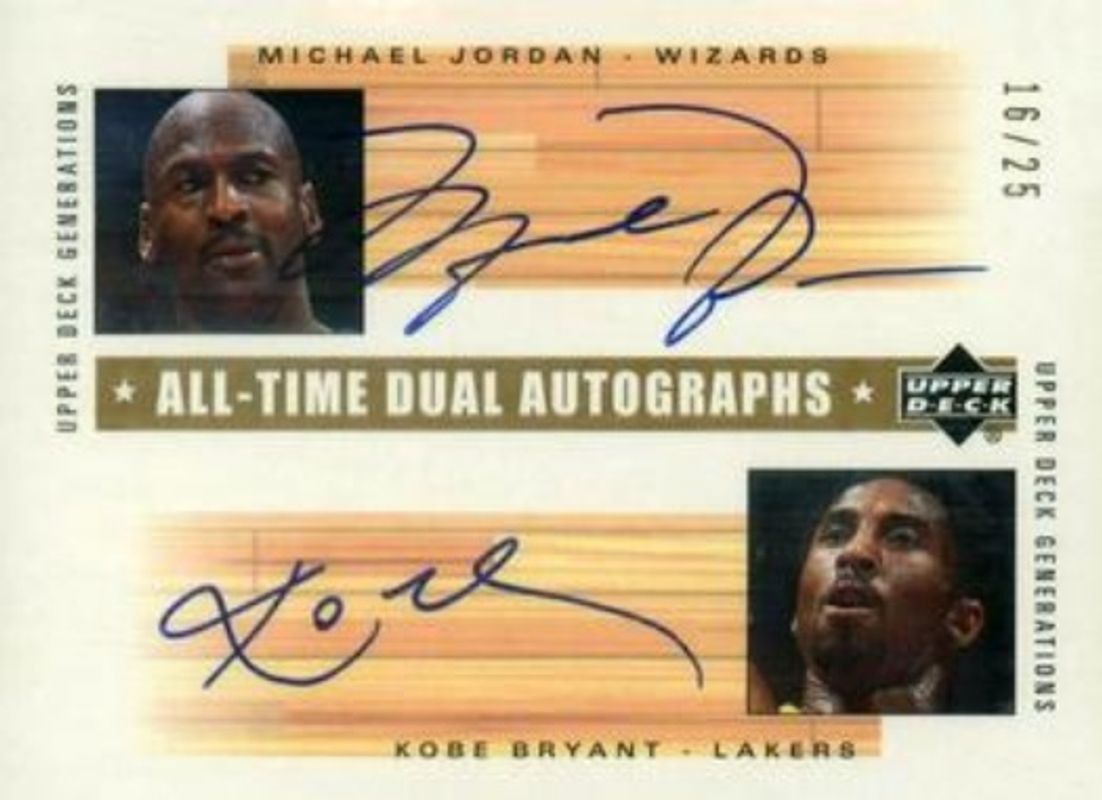 The Kobe Bryant / Michael Jordan 2002 Upper Deck Generations #MJ/KB All Time Dual Autographs /25 card is 1 of 2 Kobe Bryant / Michael Jordan's card variations in the 2002 Upper Deck Generations set being tracked by Sports Card Investor, including All Time Dual Jerseys /100.